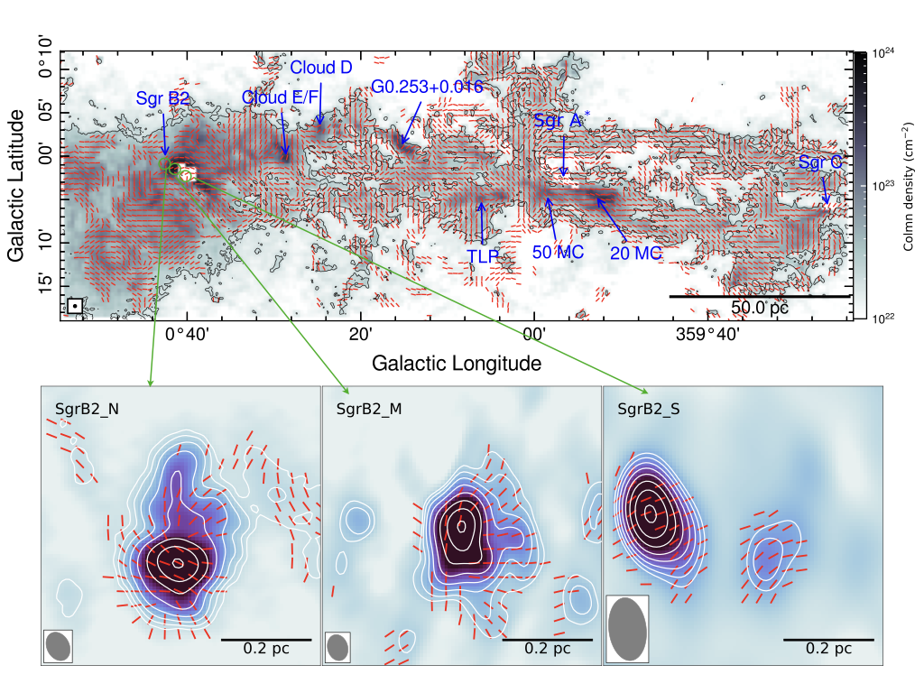 Top: Magnetic field orientations across the CMZ, with red segments showing plane-of-sky fields from SOFIA/HAWC+. Bottom: Magnetic field morphologies in three active star-forming regions within Sgr B2 observed by SMA.